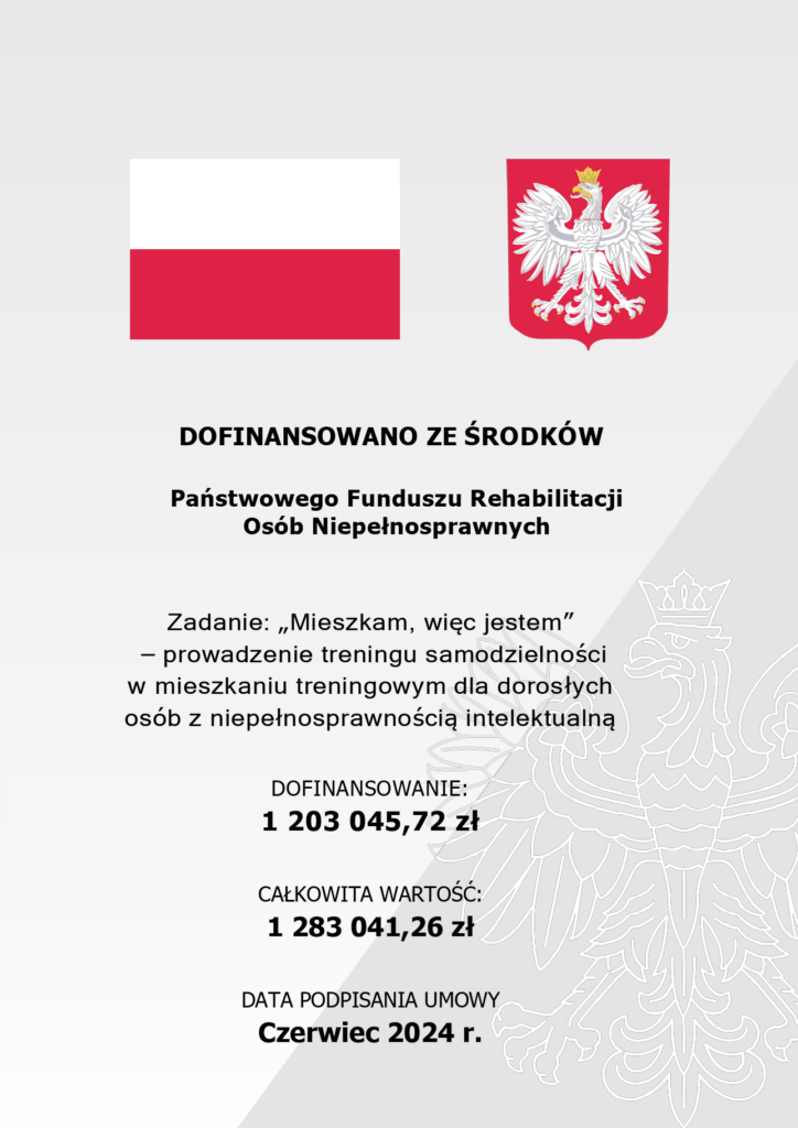 Projekt jest realizowany przez Polskie Stowarzyszenie na rzecz Osób z Niepełnosprawnością Intelektualną w Jaworznie i współfinansowany ze środków PFRON